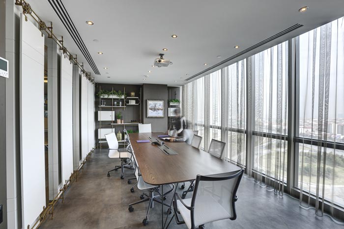 会议室的设计:设计师在设计的时候,将其安置在独立的空间之中,设计师将会议桌安置在空间的中心区域,以此保证空间的动线得以完整,其次就是空间的一面完全由落地窗户组成,这样保证了空间的通透与明亮,让会议变得有意思起来,让气氛不在沉闷。