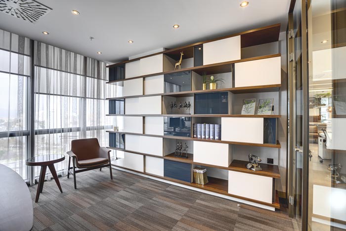 总经理办公室展示区域的设计:设计师在设计的时候,为了保证空间的完整性,故此在选择展示柜的时候,重点在于色彩与造型之上进行甄选,在设计师看来展示柜不仅需要起到储藏与展示作用,还需要与整个空间搭配,这样的好处就是既保证了其实用性、也保证了其观赏性。