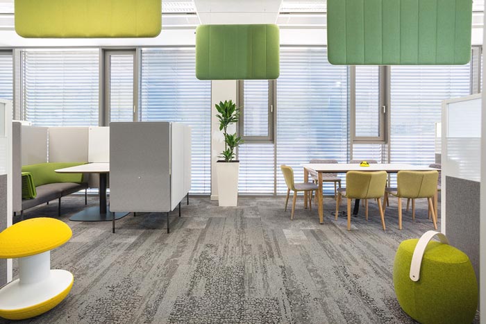 茶水间的设计:此处正对外界的草坪,阳光也明媚、充足,设计师希望给员工一个多功能的休息区域,既可以在室内品尝咖啡,又可以在草坪上玩耍,设计师希望室内与室外之间的间隔,可以在这里打破,让员工在办公的中途,也可以接触到外界的世界。